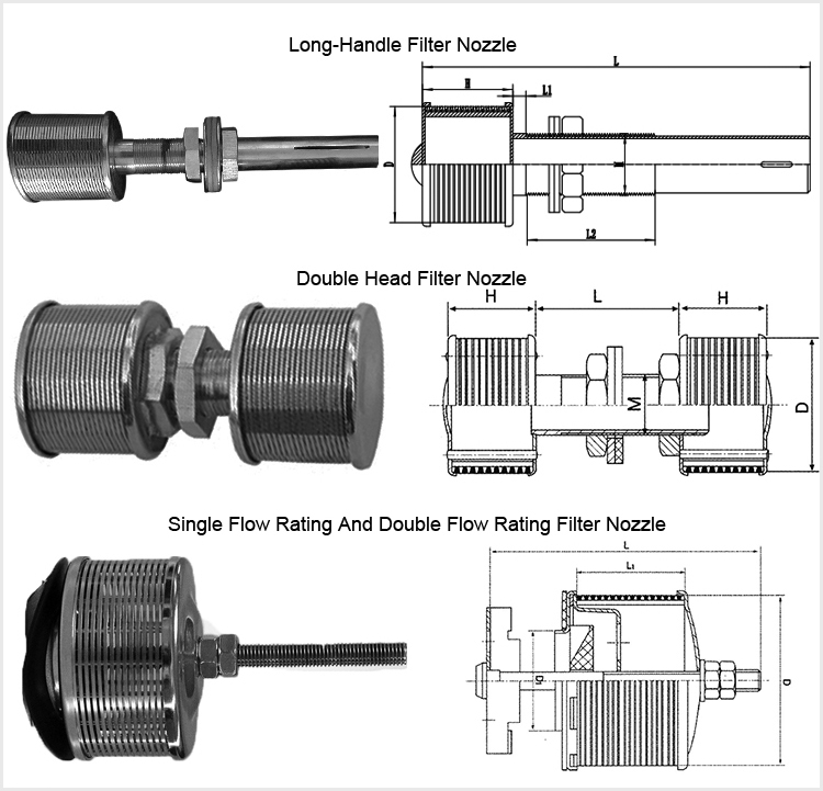 Les buses de filtre à fil en coin sont efficaces dans une large gamme de traitement de l'eau et d'autres applications industrielles pour le filtrage et le criblage. Tel que, sous vidange éléments de retenue des médias, distributeurs d'écoulement dans déminéralisation, adoucisseurs d'eau à pression et des filtres à sable par gravité.